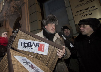 На фото: Россия. Москва. 21 декабря. Шеф-редактор "Новой газеты" Сергей Соколов (слева) со 100 тысячами подписей, собранными читателями газеты против "закона Димы Яковлева", у приемной Госдумы РФ. Фото ИТАР-ТАСС/ Евгений Фельдман / Новая газета